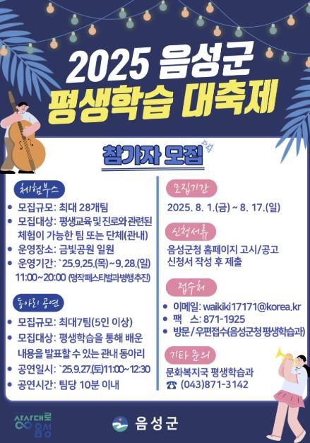 참가 신청은 이달 17일까지 가능하며, 지원 자격은 공고일(2025.8.1.) 기준 음성군에 주소(주민등록)를 둔 평생학습 관련 기관·단체·동아리, 학습자(학습공동체)이다.