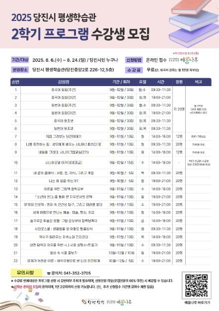 당진시 관계자는 “이번 학기 프로그램은 연령과 관심사를 아우르는 다채로운 주제로 구성해 누구나 자신의 삶에 필요한 배움을 선택할 수 있도록 기획했다”며, “앞으로도 시민의 눈높이에 맞춘 실효성 있는 평생학습 프로그램을 지속적으로 발굴하고 확대해 나가겠다”고 말했다.