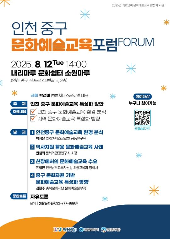 도민방송 문성호기자 | (재)인천중구문화재단은 오는 12일 오후 2시부터 내리마루 문화쉼터에서 ‘2025년 인천 중구 문화예술 교육 포럼’을 개최한다고 밝혔다.