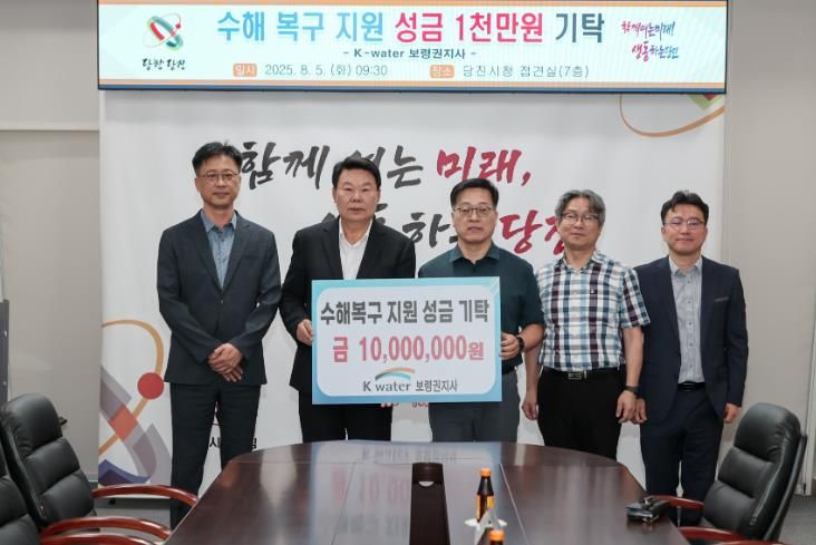도민방송 문성호기자 | 당진시는 5일 오전, K-water 보령권지사(지사장 박규영)로부터 수해복구 지원을 위한 성금 1000만 원을 전달받았다.