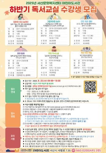 수강신청은 오는 8월 20일에 선착순 인터넷 접수로만 진행되며, 이후 대기자 및 추가 접수는 다음날인 21일 서산어린이도서관 방문 혹은 전화로 가능하다.