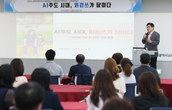 도민방송 문성호기자 | 도성훈 인천광역시교육감은 8월 4일 교육연수원에서 교육전문직원 임용예정자와 초·중등 1급 정교사 자격연수 대상자에게 ‘AI 주도 시대, 읽걷쓰가 답이다’를 주제로 강연을 진행했다.