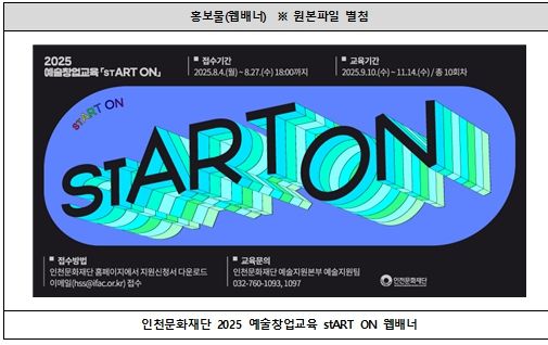 도민방송 문성호기자 | 인천문화재단은 인천 예술인의 사업적 역량강화를 위한 예술창업교육 ‘stART ON’ 참여자를 오는 8월 27일까지 모집한다고 밝혔다.