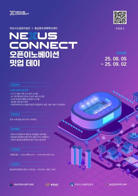 도민방송 문성호기자 | (재)충남창조경제혁신센터는 지역 공공 인프라 운영 전문기관인 아산시시설관리공단과 함께 ‘2025 Nexus Connect 오픈이노베이션 밋업 데이’를 개최하고, 수요기술에 부합하는 스타트업을 오는 8월 5일부터 9월 2일까지 모집한다.
