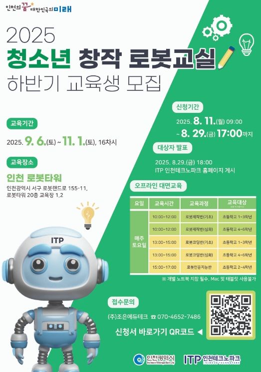 도민방송 문성호기자 | 인천테크노파크(인천TP)는 AI 시대를 선도할 로봇 과학자 양성을 위해 ‘청소년 창작 로봇교실’ 하반기 교육생 125명을 8월 11일부터 선착순 모집한다.