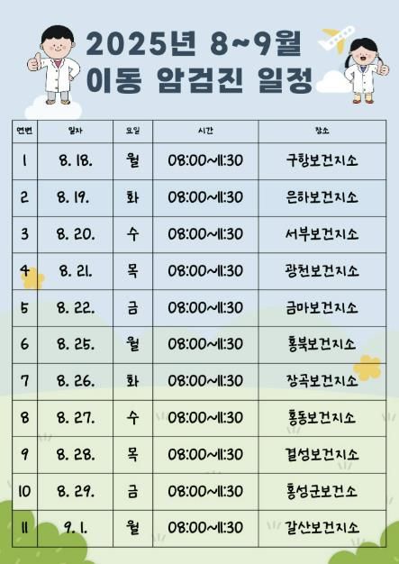 한편 검진 일정은 ▲8월 18일 구항보건지소 ▲8월 19일 은하보건지소 ▲8월 20일 서부보건지소 ▲8월 21일 광천보건지소 ▲8월 22일 금마보건지소 ▲8월 25일 홍북보건지소 ▲8월 26일 장곡보건지소 ▲8월 27일 홍동보건지소 ▲8월 28일 결성보건지소 ▲8월 29일 홍성군보건소 ▲9월 1일 갈산보건지소 순이다.