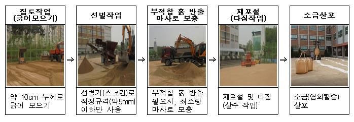이번 정비사업의 주요 내용은 ▲마사토 운동장 재포설, ▲운동장 배수로 청소, ▲노후·파손 배수로 덮개 교체, ▲기타 체육활동에 필요한 안전시설 보수 등이며, 정비사업을 학사일정에 지장이 없도록 여름방학 기간을 활용해 오는 8월까지 완료할 예정이다.