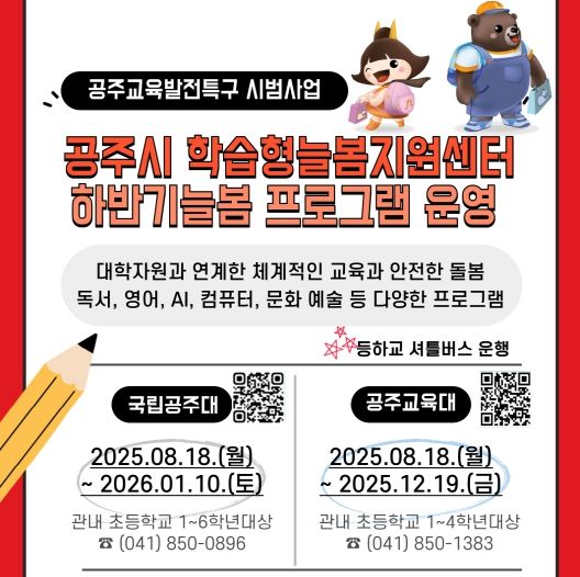 이번 하반기 프로그램은 오는 8월 18일부터 국립공주대학교와 공주교육대학교에서 진행되며, 영어 회화, 독서, 문화·예술 교육 등 총 21개 프로그램에 420명의 학생을 모집할 예정이다.