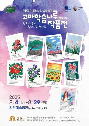 도민방송 문성호기자 | 공주시 의당면평생학습센터 고마학습나루(청룡1리 마을회관) 학습자들이 참여한 ‘천아트’ 프로그램의 결과물을 선보이는 전시회가 8월 4일부터 29일까지 공주시의회 시민예술공간에서 열린다.