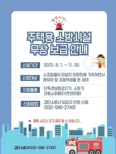 한편, 검단소방서는 스프링클러가 설치되지 않은 아파트에 거주하며 초등학생 이하 자녀가 있는 가정을 대상으로 주택용 소방시설 무상 보급 신청을 받고 있다.