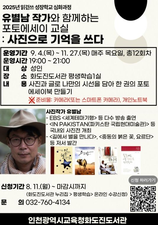 도민방송 문성호기자 | 인천광역시교육청화도진도서관은 2025년 '읽걷쓰 성장학교' 심화과정의 일환으로 유별남 작가와 함께하는 ‘포토에세이 교실: 사진으로 기억을 쓰다’의 수강생을 모집한다.