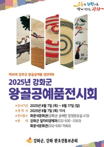 전시회 첫날인 7일에는 ‘제36회 강화군 왕골공예품 경진대회’ 입상자에 대한 시상식 및 개막식 행사가 열리며, 이후부터는 이번 경진대회 입상작 8점을 포함한 다채로운 왕골공예 작품들이 전시된다.