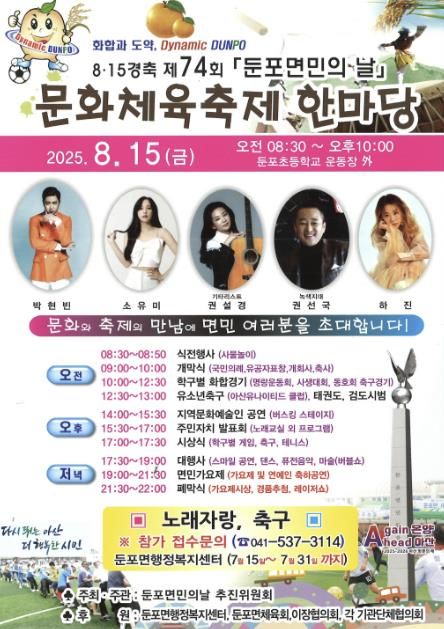 도민방송 문성호기자 | 아산시 둔포면은 오는 8월 15일 광복절을 맞아 ‘광복 80주년과 함께하는 제74회 둔포면민의 날’ 행사를 둔포초등학교 일원에서 개최한다.