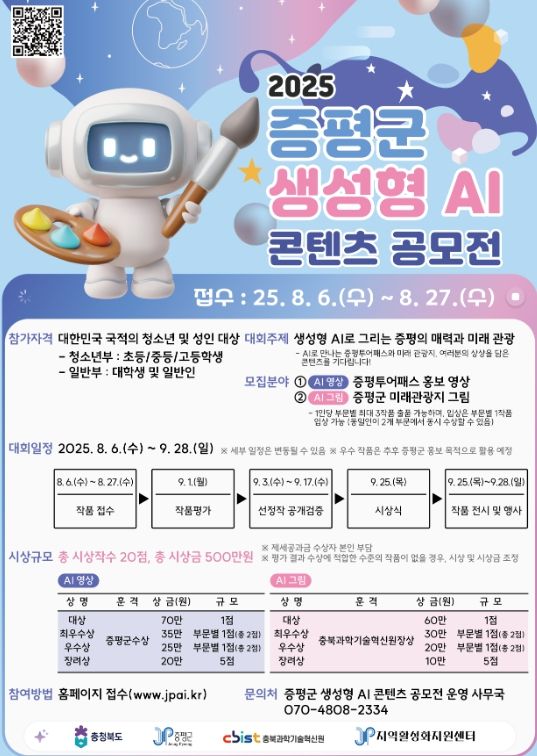 도민방송 임경희기자 | 충북 증평군이 지역 문화관광 자원에 생성형 AI 기술을 결합해 증평의 미래를 창의적으로 재해석하는 ‘2025 AI 콘텐츠 공모전 – 증평을 그리다!’를 개최한다.