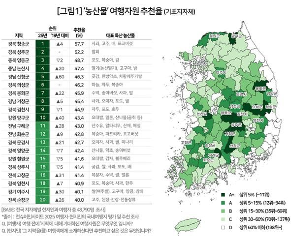 이번 조사는 컨슈머인사이트가 2025년 6월 전국의 여행객, 현지인 총 4만 8천여 명을 대상으로 진행했으며, 재래시장·지역축제 등 총 58개 여행자원 가운데 농산물은 추천율 20.3%로 전체 8위를 차지했다.