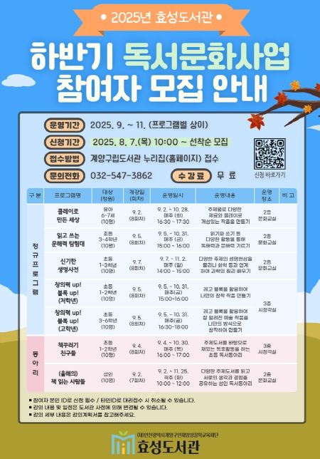 신청은 8월 7일 오전 10시부터 계양구립도서관 누리집을 통해 선착순 접수되며, 기타 자세한 사항은 효성도서관으로 문의하면 된다.