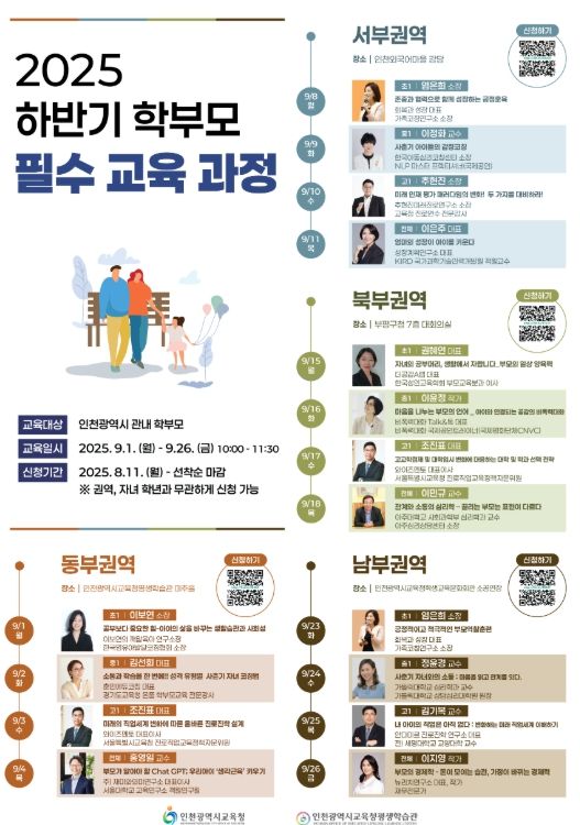 도민방송 문성호기자 | 인천광역시교육청평생학습관은 자녀 교육 역량을 높이고 자기 성장을 돕기 위한 ‘2025년 하반기 학부모 필수 교육과정’의 수강생을 모집한다.