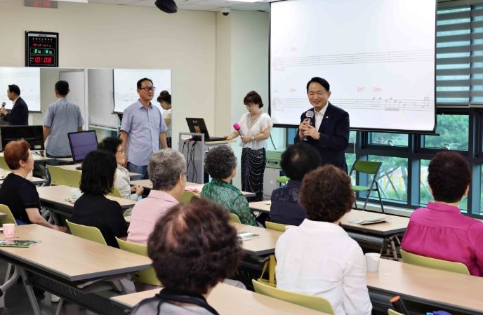 김찬진 청장은 노래교실 수강생들과 담화를 나누며 생활 속 애로사항과 건의 사항을 경청했다.