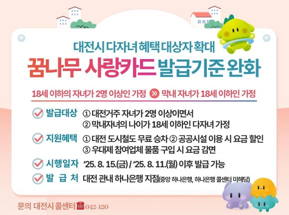 도민방송 정연호기자 | 대전시가 다자녀 가정을 위한 ‘꿈나무사랑카드’ 발급 기준을 오는 8월 15일부터 완화한다.