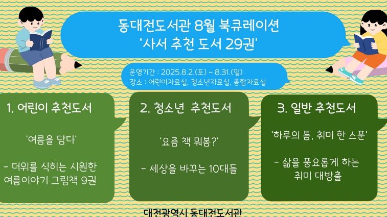 도민방송 정연호기자 | 동대전도서관은 8월 한 달 동안 연령별 맞춤형 북큐레이션 프로그램 ‘사서 추천 도서 29권’을 운영한다.
