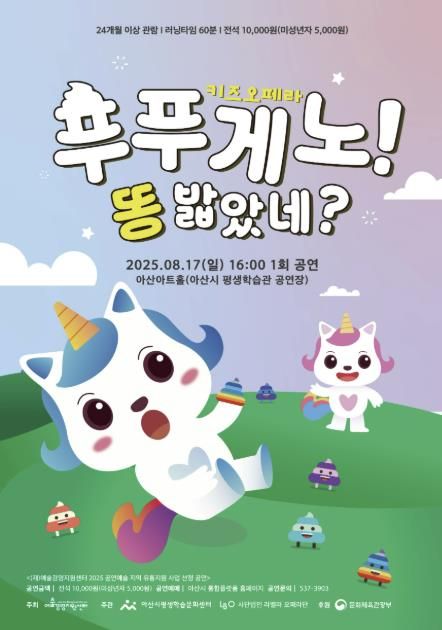 도민방송 문성호기자 | 아산시가 ‘2025 공연예술 유통 지원사업’에 선정된 작품 키즈오페라 ‘푸푸게노! 똥 밟았네?’를 8월 방학 시즌을 맞아 17일 아산아트홀에서 개최한다.