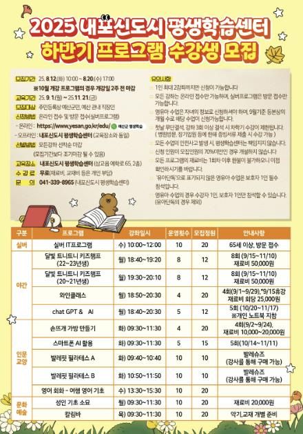 도민방송 문성호기자 | 예산군 내포신도시 평생학습센터는 오는 8월 12일부터 20일까지 하반기 프로그램 수강생을 모집하고 9월 1일부터 본격적인 프로그램 운영에 돌입한다고 밝혔다.