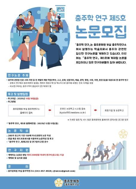 투고된 논문은 소정의 심사를 거쳐 오는 12월 15일 발행 예정인 ‘충주학 연구’ 제5호에 수록되며, 수록이 확정된 논문에 대해 1편당 최대 200만 원의 연구비를 지급할 예정이다.
