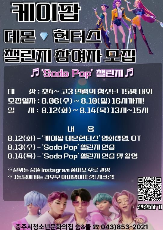 도민방송 임경희기자 | 충주시 청소년문화의집 숨·뜰은 청소년들의 문화예술 활동을 장려하고자‘케이팝 데몬헌터스’ 영화 속 노래 ‘소다 팝(Soda Pop)’ 춤 챌린지 프로그램을 진행한다고 밝혔다.