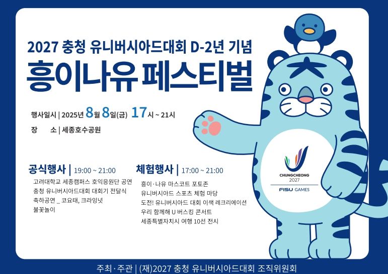 (도민방송=충남) 문성호기자기자 2027 충청 유니버시아드대회 조직위원회는 오는 8월 8일 저녁 7시, 세종 호수공원에서 2027 충청 유니버시아드대회 D-2년 기념 ‘흥이나유 페스티벌’을 개최한다고 밝혔다.