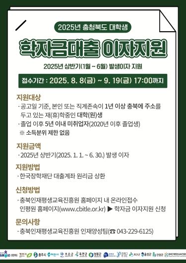신청 접수는 2025년 8월 8일부터 9월 19일 오후 5시까지이며, 충북인재평생교육진흥원 홈페이지 내 ‘학자금대출 이자지원 신청’에서 온라인으로 신청할 수 있다.