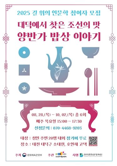 강연뿐 아니라 음식 시연, 상차림 구성 체험을 통해 전통 식문화의 의미를 직접 경험할 수 있으며, 이 프로그램은 8월 28일부터 10월 2일까지 매주 목요일 오후 3시~5시 30분, 소대헌·호연재 고택에서 총 6회 진행된다.