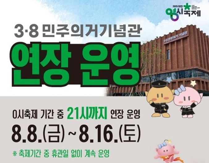 (도민방송 정연호기자) 대전시 3·8민주의거기념관은 0시 축제 기간 연장 운영에 들어간다. 밤 21시까지 운영하고, 휴관일도 사라진다. 관람은 무료다.