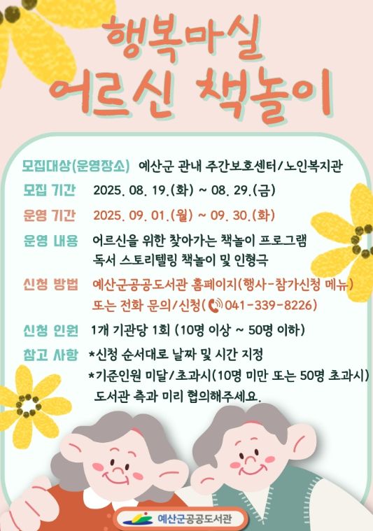 (도민방송=충남) 문성호기자 | 예산군 공공도서관은 오는 9월 관내 주간보호센터, 노인종합복지관 등 노인복지시설을 직접 방문해 책놀이와 인형극 등 다양한 독서 연계 활동을 제공하는 ‘행복마실 어르신 책놀이’ 프로그램을 운영한다.