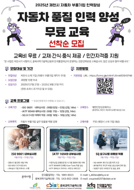 한편, 교육에 대한 자세한 사항은 한국품질재단, 충북과학기술혁신원 제천시청 투자유치과로 문의하면 된다.