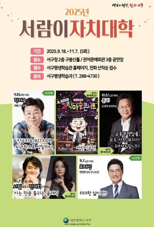 (도민방송 정연호기자) 대전 서구는 오는 9월 18일 정재승 KAIST 교수의 ‘인공지능(AI) 시대, 뇌과학으로 성찰하다’ 강연을 시작으로 ‘2025년 하반기 서람이 자치대학’을 운영한다고 밝혔다.