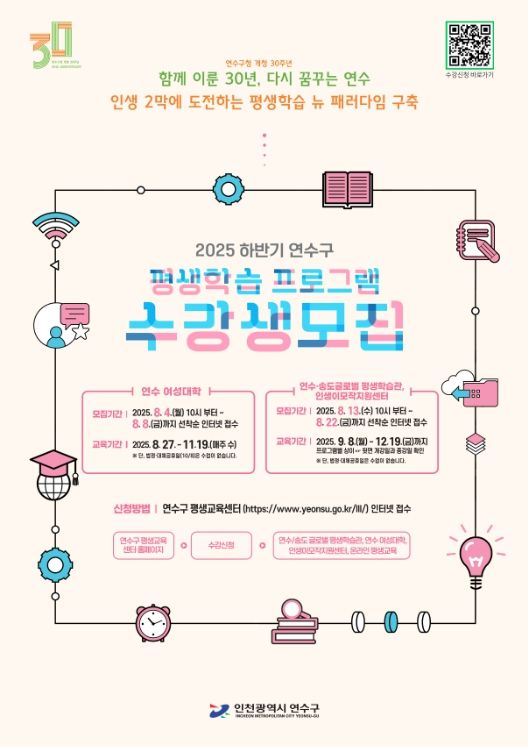 (도민방송=충남) 문성호기자 | 연수구는 구민의 배움과 성장을 지원하기 위해 연수·송도 글로벌 평생학습관 ‘2025년 하반기 평생학습 프로그램’ 수강생을 오는 13일부터 모집한다.