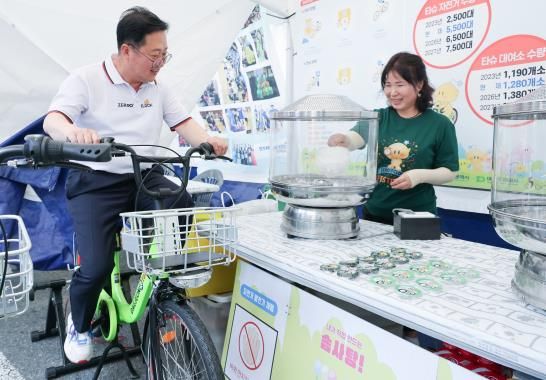 (도민방송 정연호기자) 공영자전거 타슈를 이용한 이색 체험 부스가 ‘2025 대전 0시 축제’에 등장하며 화제다.