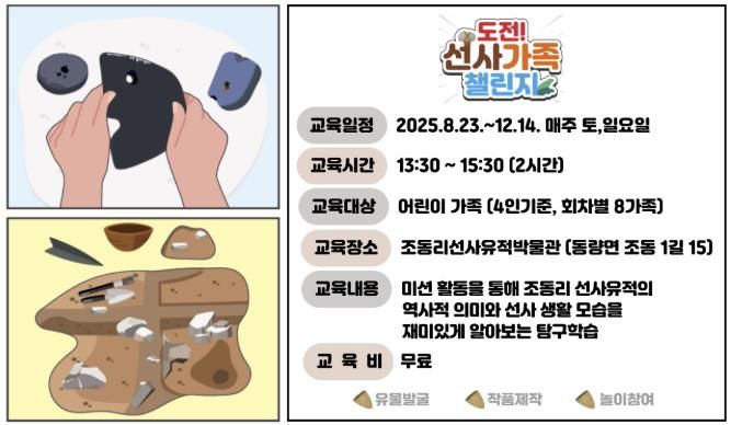 ‘도전! 선사가족 챌린지’는 주말 가족 프로그램으로 미션 수행을 통해 조동리 선사유적의 역사적 의미와 선사인의 생활 모습을 재미있게 알아보는 탐구학습 프로그램이다.