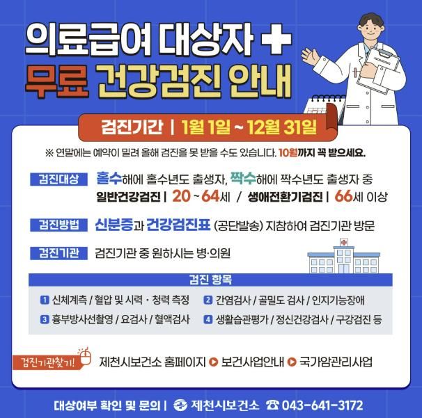 건강검진은 검진의료기관으로 지정받은 곳이라면 전국 어디서나 검진이 가능하며, 국민건강보험공단 누리집, 콜센터 또는 제천시 보건소를 통해 검진 대상 여부와 검진 기관을 안내받을 수 있다.