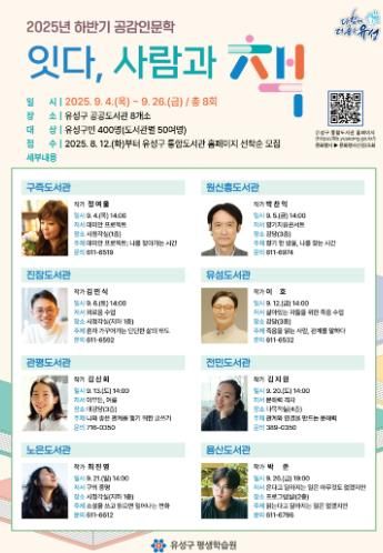 (도민방송 정연호기자) 대전 유성구는 9월 ‘독서의 달’을 맞아 한 달간 관내 8개 공공도서관에서 2025년 하반기 공감인문학 강연 ‘잇다, 사람과 책’을 운영한다.