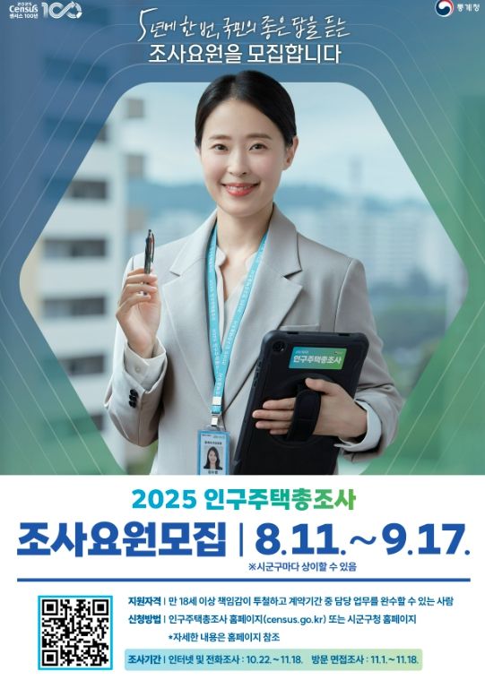 (도민방송=충남) 문성호기자 | 논산시는 오는 11월 실시되는 ‘2025년 인구주택총조사’를 앞두고 정확한 통계 생산과 원활한 진행을 위해 조사요원 84명을 모집한다.