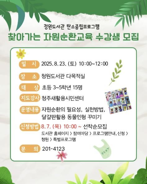 (도민방송 임경희기자) 청주청원도서관은 탄소중립 실천과 인식 확산을 위해 오는 23일 오전 10시부터 낮 12시까지 도서관에서 초등 3~5학년을 대상으로 자원순환 교육 프로그램을 운영한다.