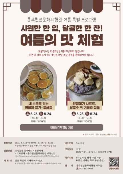 (도민방송=충남) 문성호기자 | 홍성군 홍주천년문화체험관은 무더운 여름을 시원하게 보낼 수 있도록 오는 23일부터 24일까지 양일간 여름 특별 프로그램 ‘시원한 한 입, 달콤한 한 잔! 여름의 맛 체험’을 운영한다고 밝혔다.