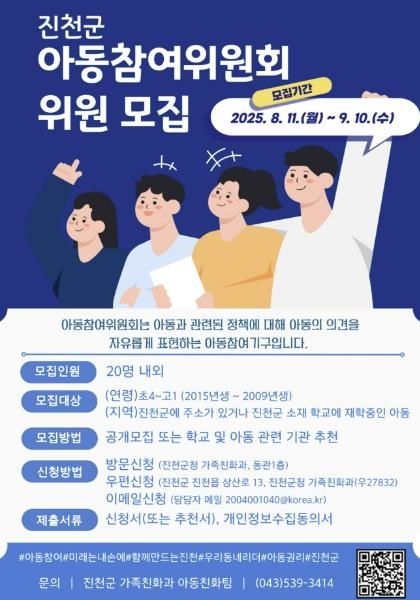 이번 신규위원 모집 인원은 20명 내외로 공개모집과 기관추천으로 진행하며, 진천군에 주민등록이 돼 있고, 관내 학교에 재학 중인 초등학교 4학년 이상 고등학교 1학년 이하 아동은 누구나 지원할 수 있다.