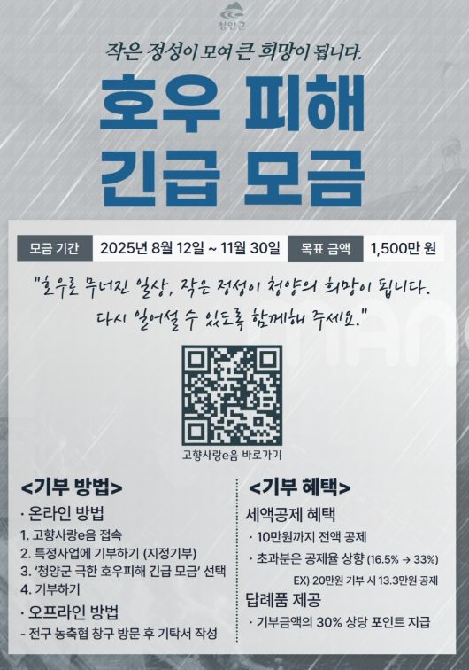 (도민방송=충남) 문성호기자 | 청양군이 지난 7월 집중호우로 큰 피해를 입은 군민들의 조속한 일상 회복을 돕기 위해 ‘고향사랑기부제’ 지정기부사업을 통한 긴급 모금에 나섰다.