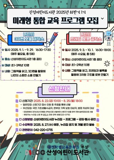 (도민방송 정연호기자) 대전학생교육문화원(원장 엄기표) 부설 산성어린이도서관은 초등학생의 미래 역량 향상을 위한 '미래형 통합 교육 프로그램'을 오는 9월부터 세 달간 총 20회에 걸쳐 운영한다고 밝혔다.