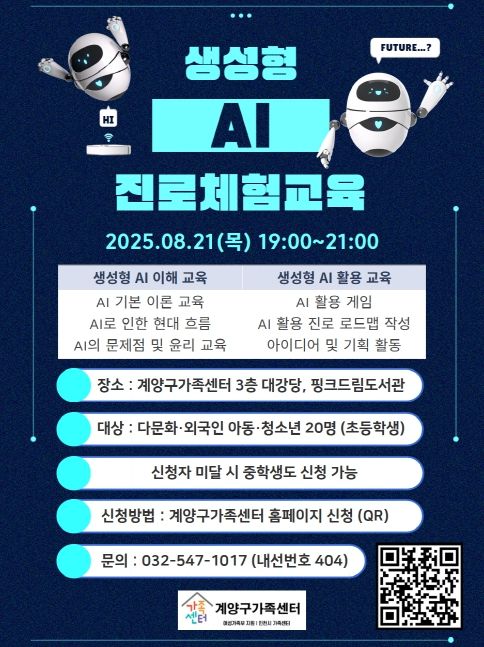 (도민방송=충남) 문성호기자 | 인천 계양구가족센터는 8월 21일 ‘생성형 AI 진로체험’ 프로그램을 진행한다고 밝혔다.