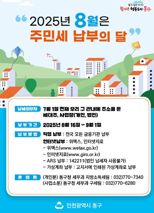 (도민방송=충남) 문성호기자 | 인천 동구는 2025년도 주민세(개인분) 약 2억 원을 부과하고 지난 11일 고지서를 우편 발송했다고 밝혔다. 과세대상은 7월 1일 동구에 주소를 둔 개인 세대주이며 납부기간은 9월 1일까지다.