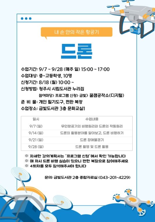(도민방송 임경희기자) 청주금빛도서관이 9월 중·고등학생을 대상으로 디지털 융합 프로그램 ‘내 손 안의 작은 항공기: 드론’을 운영한다.