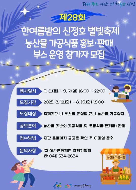 (도민방송=충남) 문성호기자 | (재)아산문화재단은 9월 6일부터 9월 7일까지 이틀간 신정호정원 야외음악당 일원에서 진행되는 '제28회 한여름밤의 신정호 별빛축제'에서 농산물 가공식품 홍보·판매 부스를 운영할 참가자를 8월 19일 18시까지 공개 모집한다고 밝혔다.